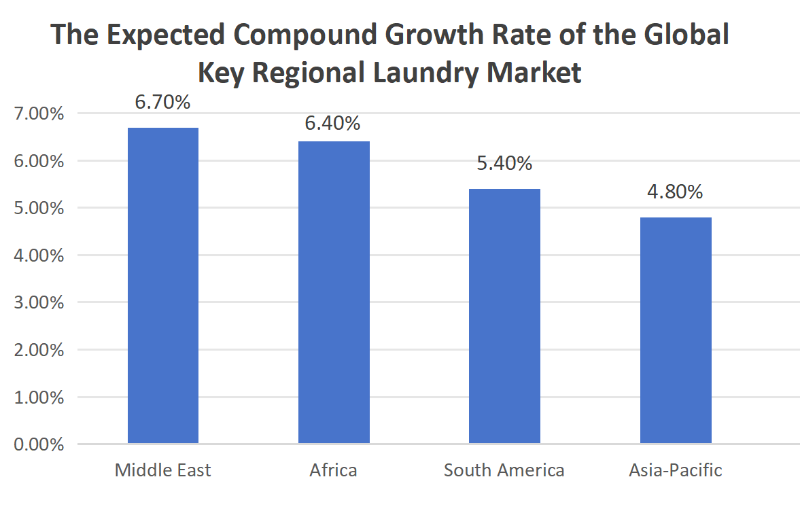 Memandang ke hadapan, Timur Tengah dan Afrika dijangka menjadi wilayah yang paling pesat berkembang untuk pasaran perkhidmatan cucian kering dan cucian air pada CAGR masing-masing 6.7% dan 6.4%. Amerika Selatan dan Asia Pasifik seterusnya, dengan CAGR pasaran masing-masing sebanyak 5.4% dan 4.8%.