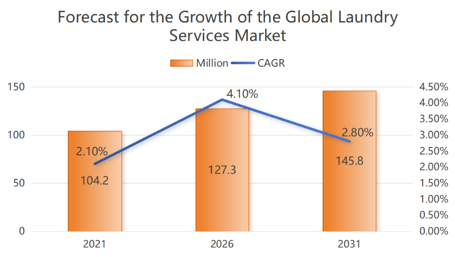 Baru-baru ini, penyelidikan oleh Research and Markets mendedahkan rahsia pasaran perkhidmatan dobi global. Sejak 2016, global perkhidmatan dobi pasaran telah berkembang pada CAGR 2.1% yang stabil, mencapai nilai pasaran hampir $104.2 juta pada 2021. Pertumbuhan ini berterusan tanpa henti. Ia dijangka melonjak kepada $127.3 juta menjelang 2026 pada kadar pertumbuhan 4.1%, dan kemudian terus berkembang pada kadar pertumbuhan tahunan kompaun sebanyak 2.8% untuk mencapai $145.8 juta menjelang 2031.